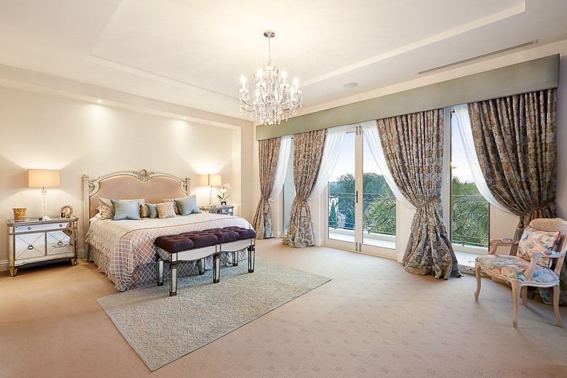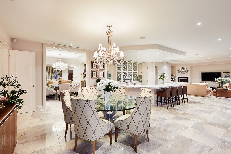 A European-style Portico with travertine flooring adds an extra element of security, as does the supreme alarm system. Individually styled double doors then open onto a magnificent entrance foyer, styled with a Murano chandelier and 20mm Crema Blue marble floors to set the tone for the lavish nature inside.